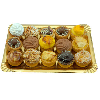 Tartaleta dulce (HARINA de TRIGO, margarina vegetal, azúcar, HUEVO, malta de CEBADA, aromatizado con miel, MANTEQUILLA, vainilla).